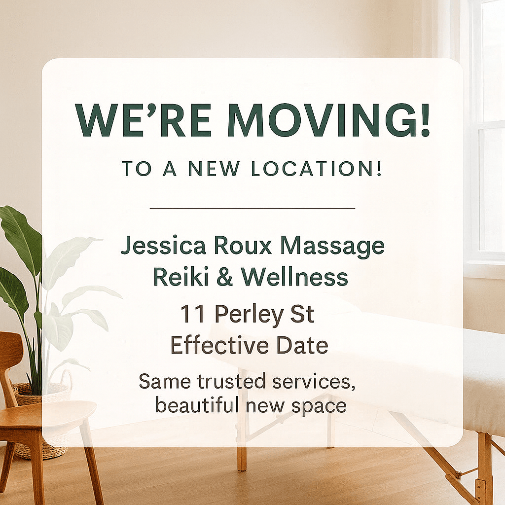 I’m thrilled to share some big news with you — Jessica Roux Massage Reiki & Wellness is moving to a brand-new space! After years of holding space for deep healing and transformation in our current location, it’s time for an exciting new chapter — and I can’t wait for you to experience it.