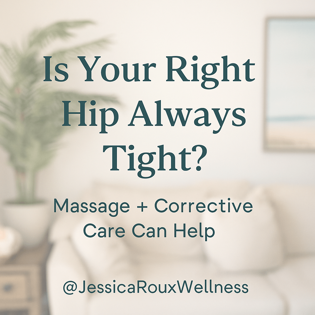 Have you ever noticed that one side of your hips feels higher, tighter, or more “off” than the other? At Jessica Roux Massage Reiki & Wellness, I often see clients—especially right-handed people—come in with a pelvis that’s rotated forward on the right side. This imbalance can cause ongoing lower back, hip, or even knee pain.